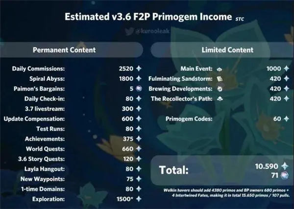 最后算下来,平民玩家可以达到大约10590原石,相当于71抽。氪金玩家、买了大月卡、小月卡的玩家,可以再加680原石、4纠缠,32抽不到,这样也能凑个100抽的样子。