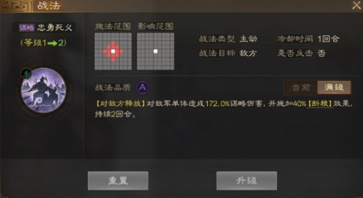 [对敌方释放]对敌军单体造成172.0%谋略伤害,并施加40% [断粮]效果,持续2回合。