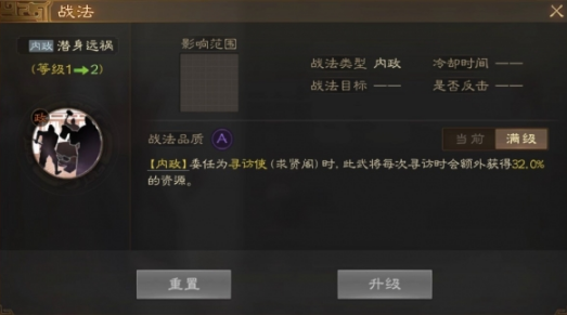 [内政]委任为寻访使(求贤阁)时,此武将每次寻访时会额外获得32.0%的资源。