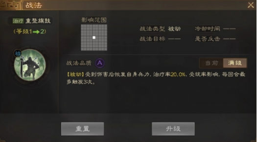 [被动]受到伤害后恢复自身兵力,治疗率20.0%,受统率影响。每回合最多触发3次。