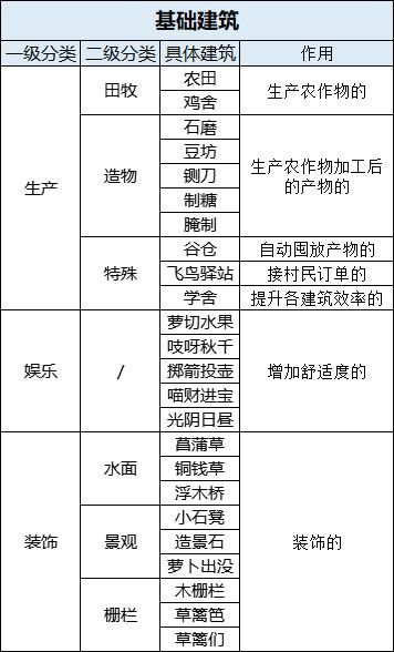 A11:在游戏下方目录栏最右边的“营造”中,可以看到建筑被分为四大类——生产、娱乐、装饰、收纳。下面是我整理的各类建筑一览表,以便各位萌新直观理解。