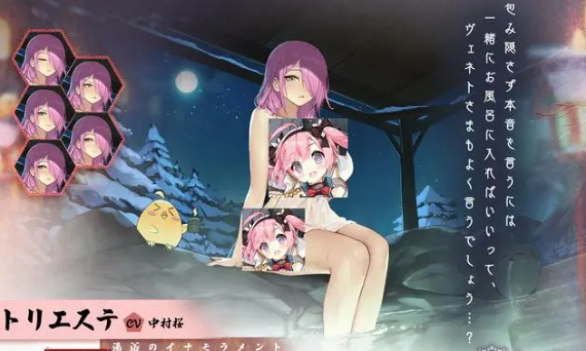先说形象,的里雅斯特算是把温泉主题皮肤发挥到了机制,要的就是这种若隐若现的朦胧感,还有本身对于皮肤上的贴合感,算是表现和直接视觉体感最好的一款,前面公开的那几款对比之下瞬间就觉得很鸡肋了,看来画师很懂行,也知道玩家想要看什么,不错,配合这舰娘本身的人设,异常契合,算是这次第一眼,就有让玩家解锁入手的欲望和想法。也算是这次设计最为离谱的。