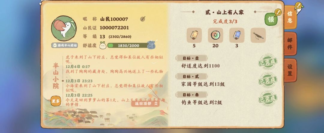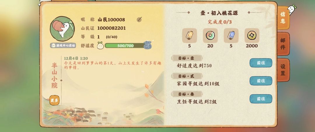 在做完我们的新手引导任务后,我们点开左上角“家园信息”就会出现下面这个界面。