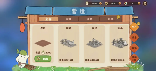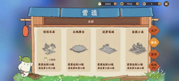 满足等级条件后,在“营造-娱乐”中购买娱乐建筑并放置于家园中。