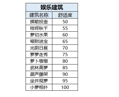 以下是我整理的娱乐建筑舒适度一览表(没有全部列完因为我自己还没升到那么多级hhh)