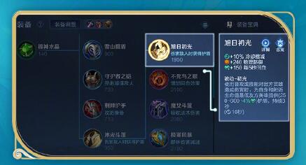 新的防御装-旭日初光,可以在加强自身防御回血的同时,利用被动技能的触发来为己方队友提供护盾保护,护盾值大小取决于自身的最大生命值。