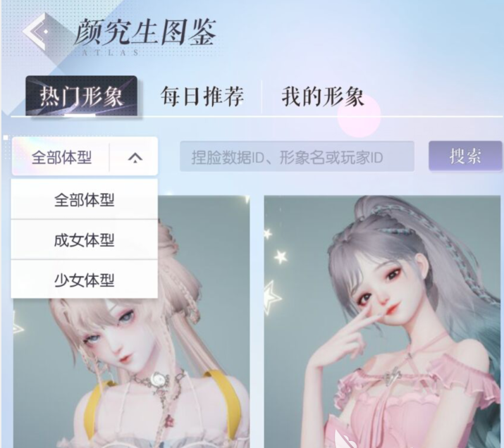 在进去以后,会发现右上角有一个“颜究生图鉴”,进去以后可以看到这里会有全部体型的形象,都是由其他玩家上传的,点击热门形象或者每日推荐,再根据自己所需要的体型来进行筛选出自己最喜欢的形象。