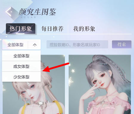 2、在重塑界面中有一个【研究生图鉴】我们可以在里面找到很多好看的捏脸,然后我们选择自己想要的体型,可以选择少女或者成女。