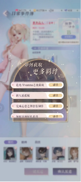 免费获取:通关主线任务,完成心意之期套装,使用分解碎片在羁绊商店购买,新手签到等活动都可免费获取羁绊,这边会发现角色不同的装扮就代表了一种羁绊,与玩家的不同类型服饰相吻合。