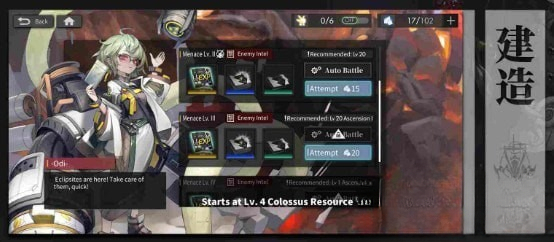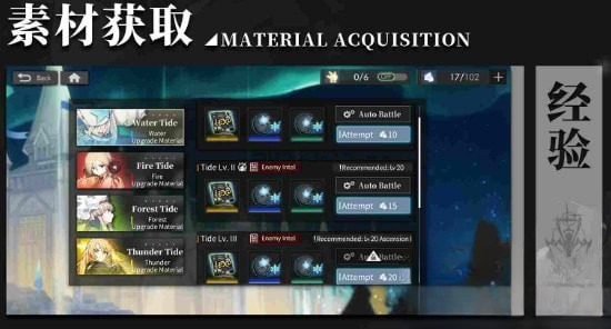 素材本分为经验、金币、建造、武器升级素材经验素材本又分为:森、炎、冰、光可以根据队伍养成选择进行刷取素材本的开放等级条件为基地建设