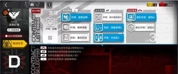 先说词条选择方面,1级词条选择地形方块的追加和限制,3级词条低保选上即可,2级词条选择可同时部署单位数量减少到5,还有就是自然恢复速度cost减半,因为都是地形和部署限制为主,真正削弱我方的只有3级词条的生命值上限,所以整体难度不算高,保证干员能顺利活着就算成功。