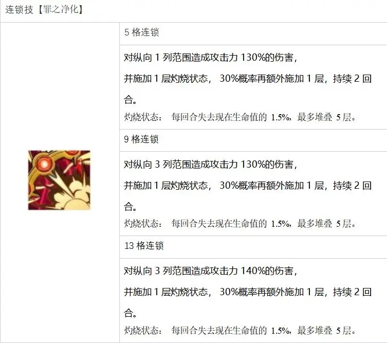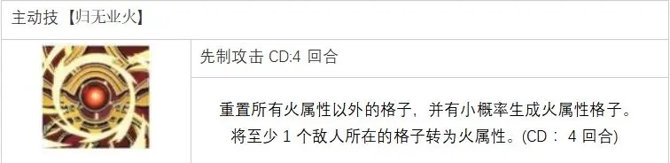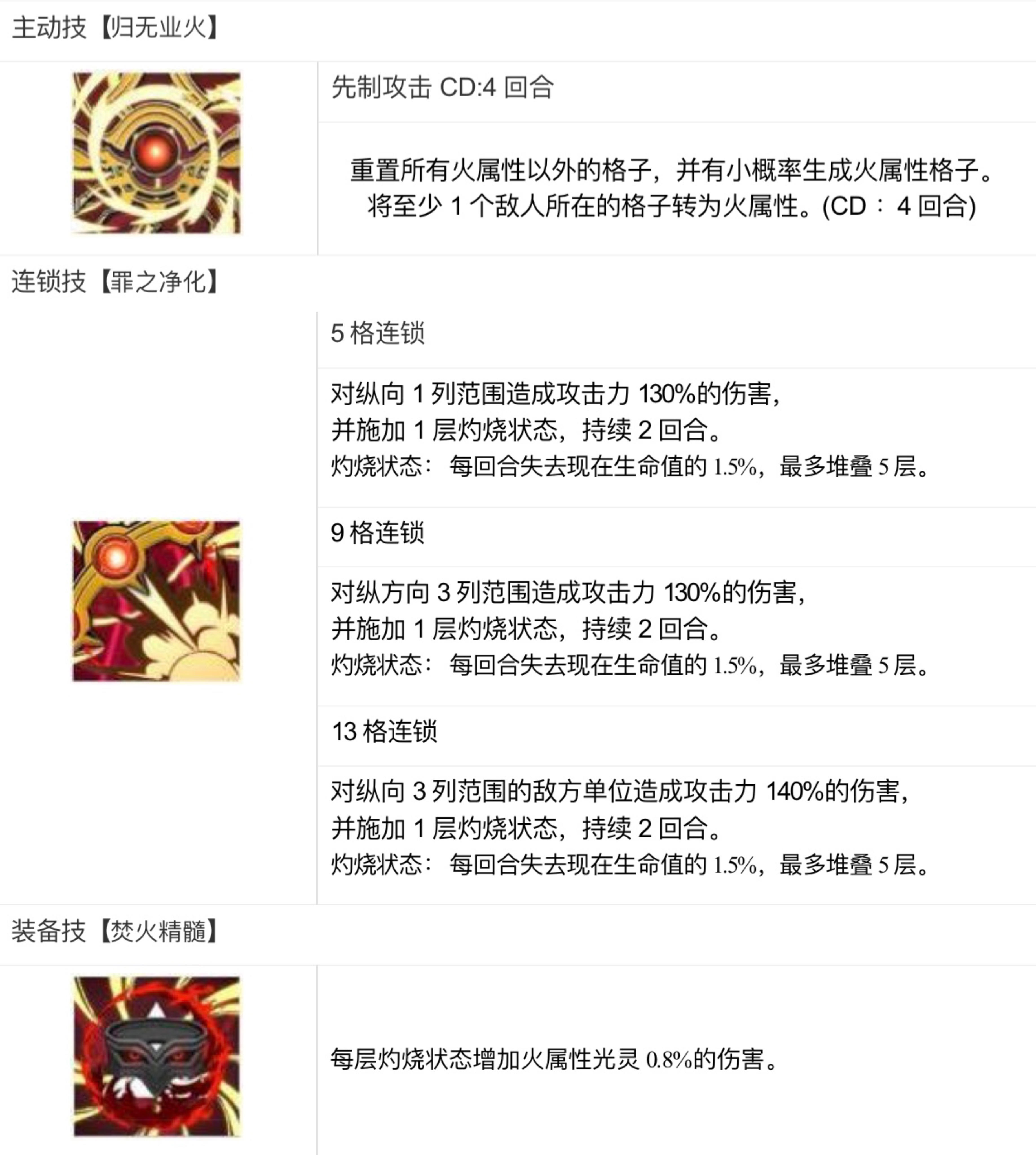 在觉醒三阶段后,每回合开始时,火属性格子上的敌人将叠加1层灼伤。配合始终将1个敌 人所在格子变为火属性的主动技能效果非常好,仅靠乌列尔也能轻松维持3层左右的灼烧。