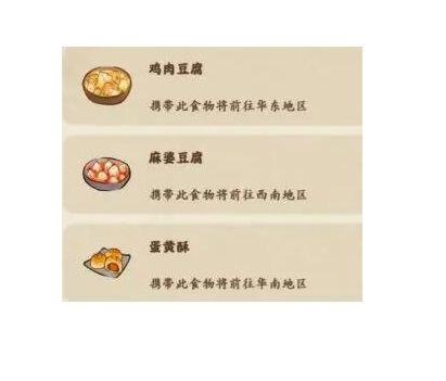 根据菜肴不同,小萝卜会前往的区域也不同,从图中可知携带鸡肉豆腐可以前往华东地区,携带麻婆豆腐可以前往西南地区,携带蛋黄酥可以前往华南地区。