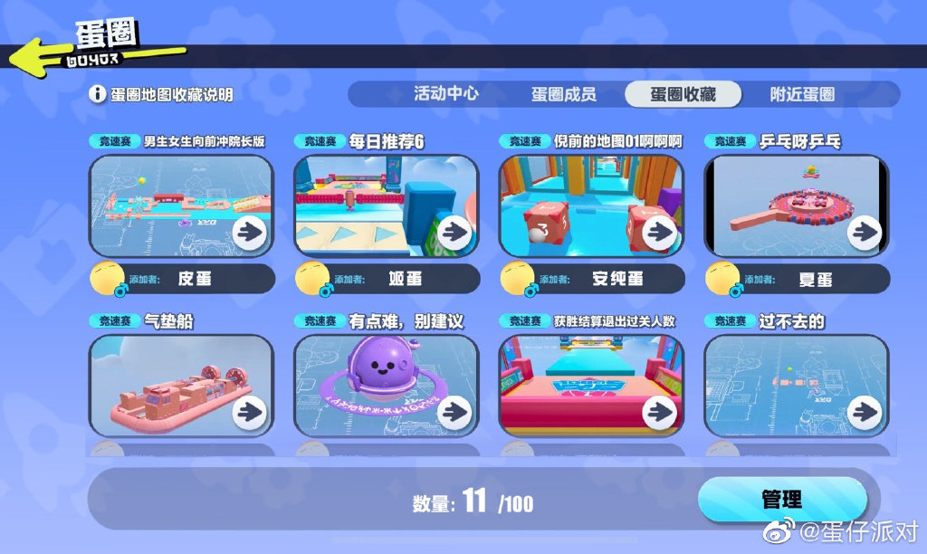 珍贵收藏分享给最好的朋友!蛋圈中所有蛋仔们收藏的地图将会在此展示,每位蛋仔最多5张地图,蛋圈内所有成员均可点击游玩!乐园地图挑花眼?不如看看大家的推荐吧!