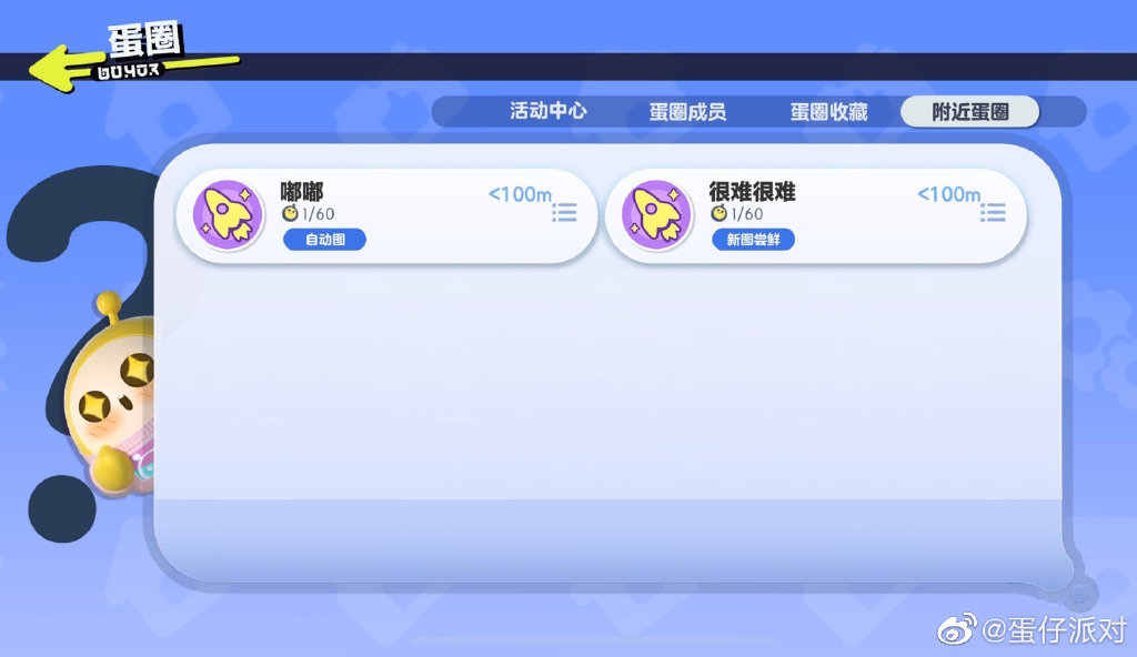 串门啦串门啦,看看隔壁的蛋玩什么?使用附近蛋圈功能即可查看其他蛋圈的成员与蛋圈收藏,点击即可进入游玩哦,如果圈友们收藏的地图都打卡完毕,不如就来这里逛逛吧!