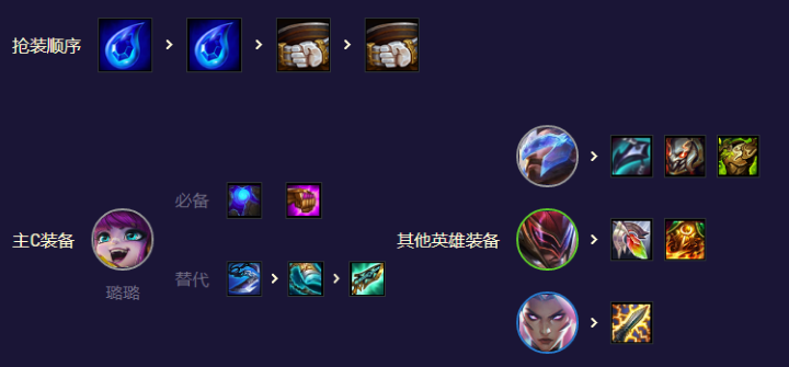 璐璐为阵容主C,回蓝装优选蓝,没有就上青龙刀,23件建议补双输出,潘森和李青看谁有专属强化给谁装备,比如金钟罩李青那就肉装给他,比如最好的进攻潘森,那肉装给他。