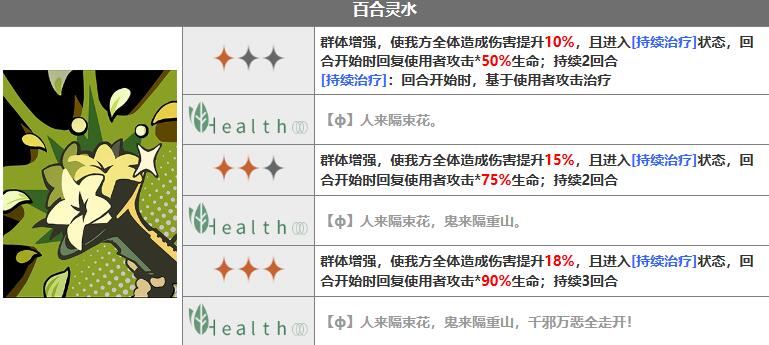 群体增强,使我方全体造成伤害提升,且进入[持续治疗]状态,回合开始时回复使用者攻击倍率的生命;持续2回合