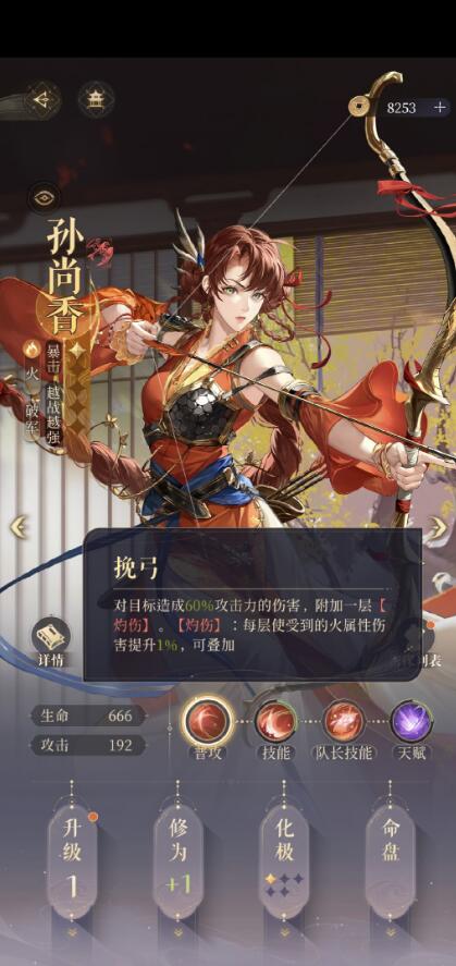孙尚香的血量很低,属于脆皮但伤害高的角色,上阵需要携带盾和奶,或者携带孙权,孙尚香有一定的概率能够转移伤害给孙权,否则还没有在场上发挥作用就会阵亡。属于后期角色,回合越多叠加buff越高,伤害越高。