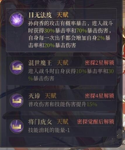 天赋:攻击有概率暴击,进入战斗时获得30%暴击率和70%暴击伤害,每一次出手增加自身2%暴击率和20%暴击伤害。