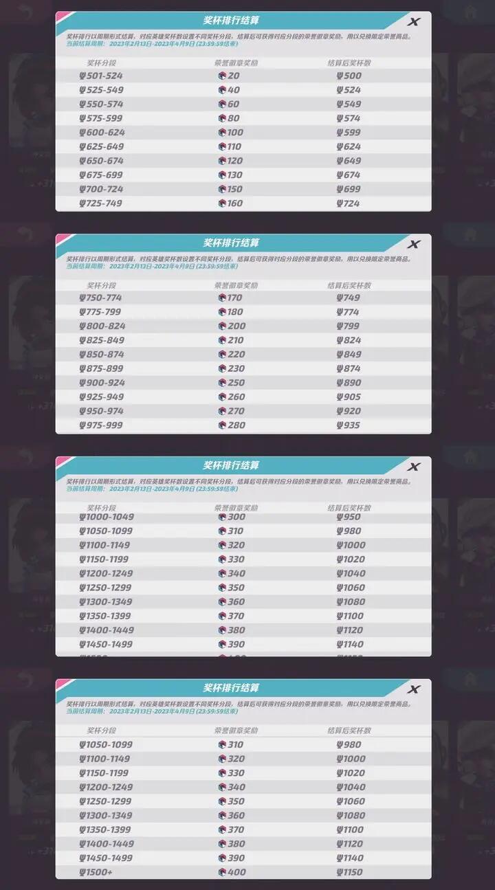 点开还可以看到结算完奖杯给多少荣誉徽章,荣誉徽章可以在商店换取皮肤等奖励。到一定杯数就给对应的荣誉徽章,可以看下图