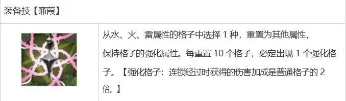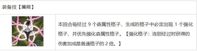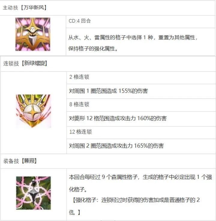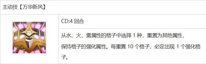 它有一个主动技能,可以选择水、火和雷属性格子中的一个,并将该属性格子转换为其他三个属性格子。转换后的结果虽然有运气成分,但棋盘可以比原来少一个属性,所以后面几回合连线会更容易。