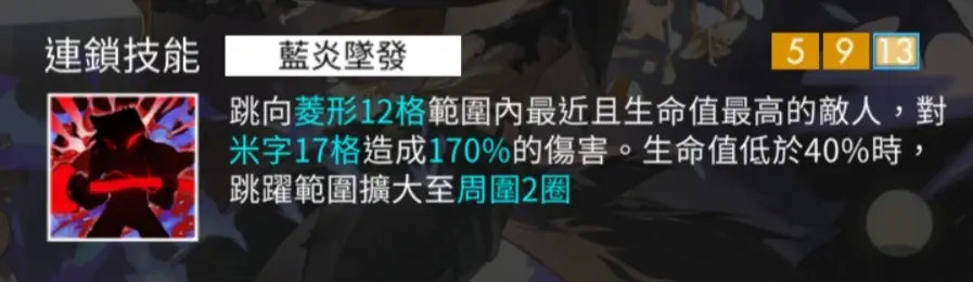 连锁技能是与木月白一样的跳跃式连锁。选取范围可跳跃范围内最近且生命值最高的敌人,跳跃至敌人身上去释放连锁。释放完连锁之后会回到连线终点,其他光灵在连线终点释放连锁。