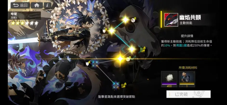 哈提的突破1提供了第二个主动技能,如果box中没有杰诺且需要组建纯色队伍去爬塔通关,那么一破提供的主动技能2是除去敌人攻击外唯二的扣除生命值的技能(另一个为的圣钉的主动技能)。