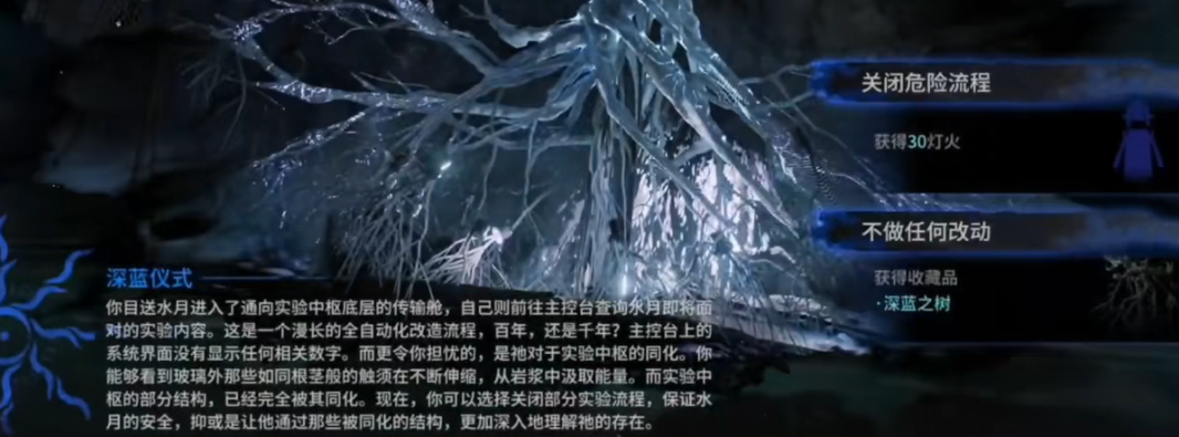 随后在下一个事件“深蓝仪式”中,选择选项“不做任何改动”,获得收藏品“深蓝之树”(敌人攻速+15,每次作战未扣血灯火+15);(非必须,但是触发了可以提升灯火,降低难度)