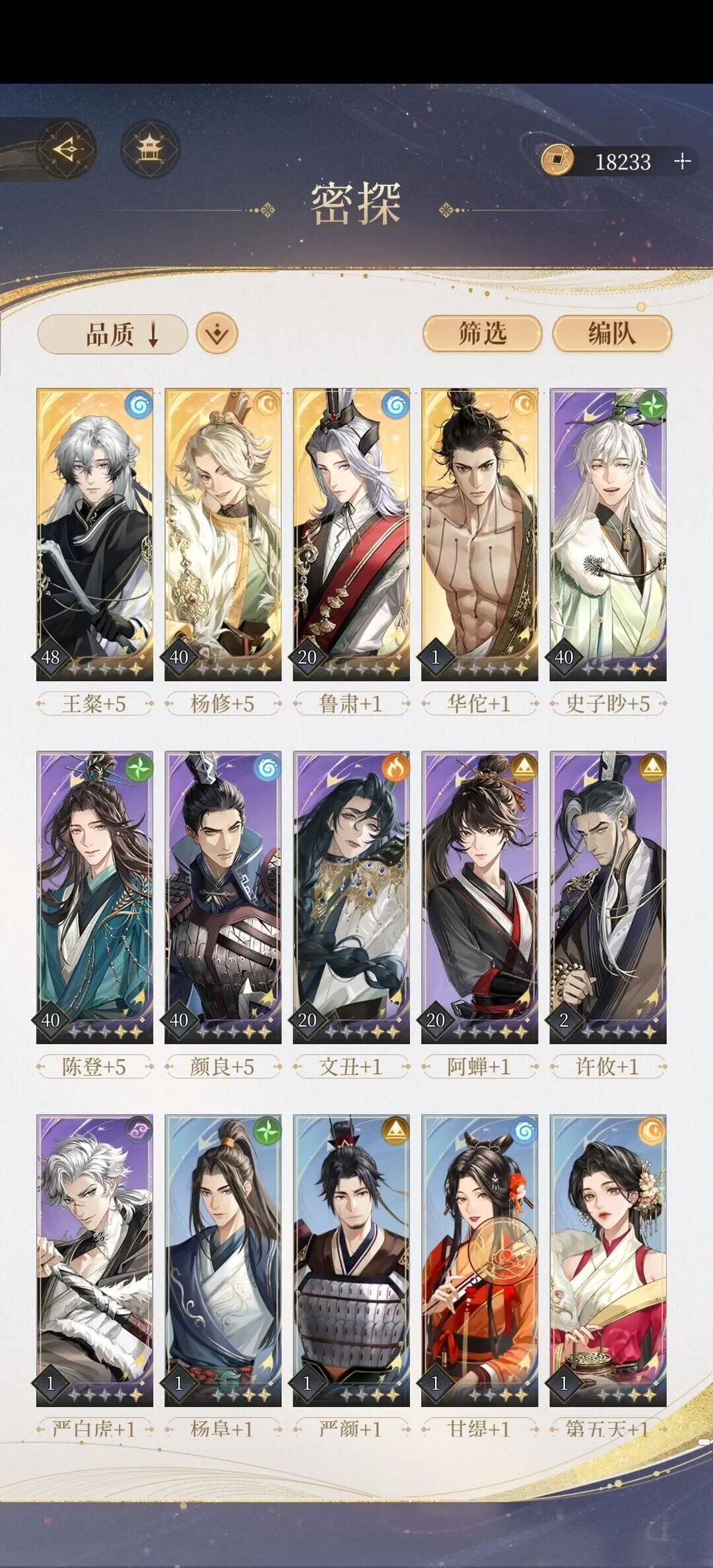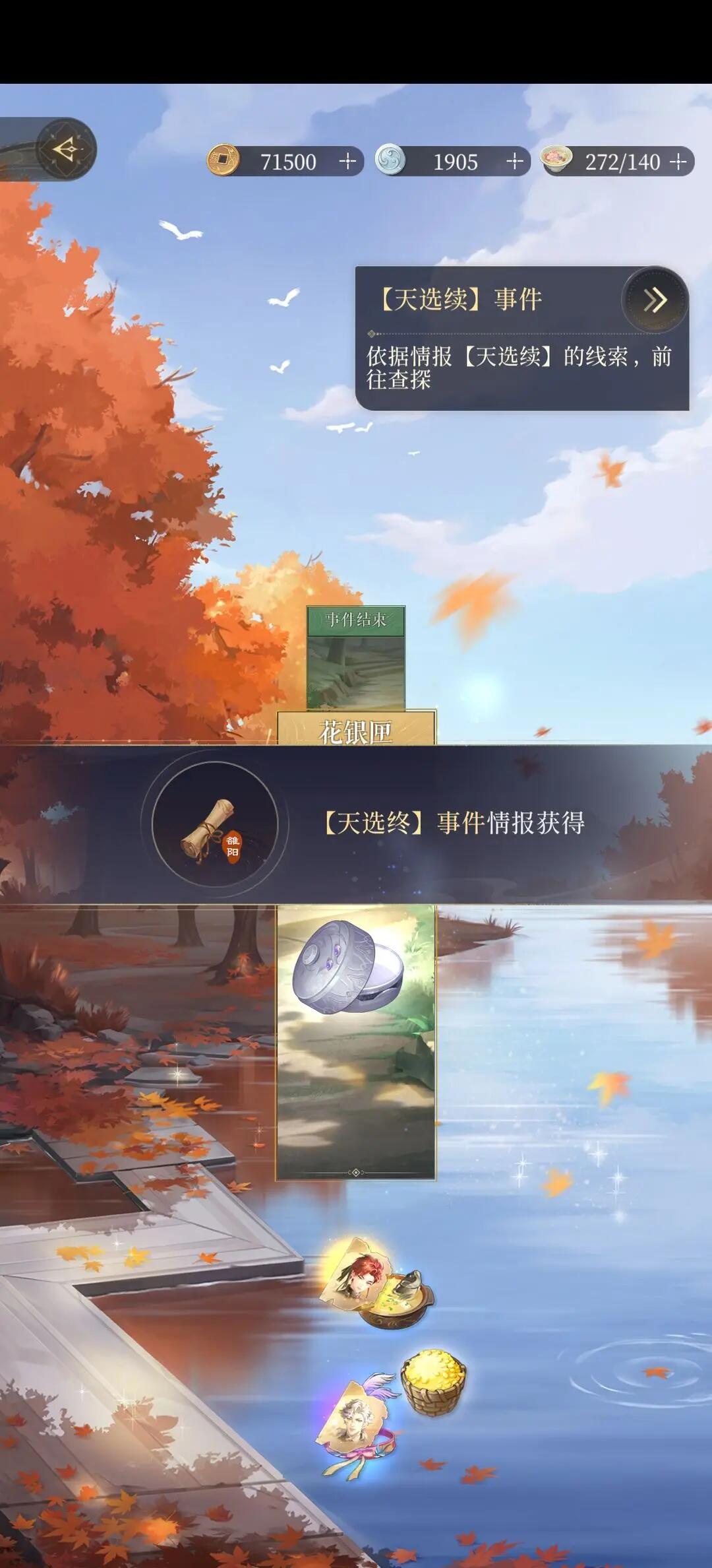 重点是!!上述这些还不算,他还有行囊任务!一星的一般是1个蒹葭,二星我忘了。三星的是掉落密探碎片!!我今天拿了两个金色的