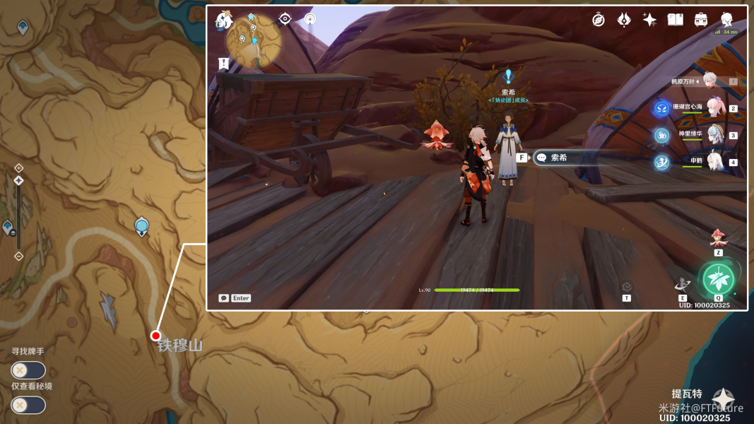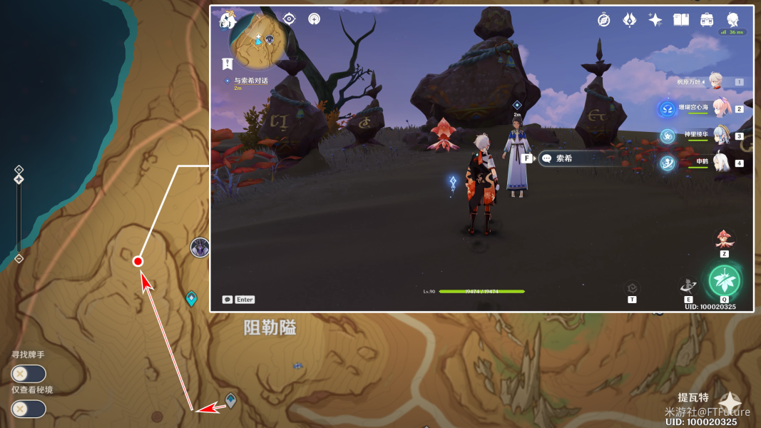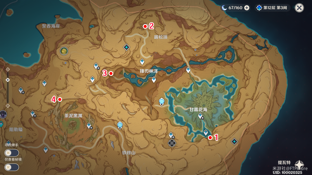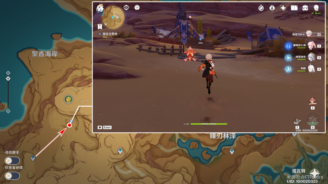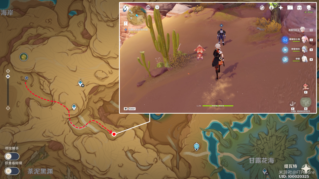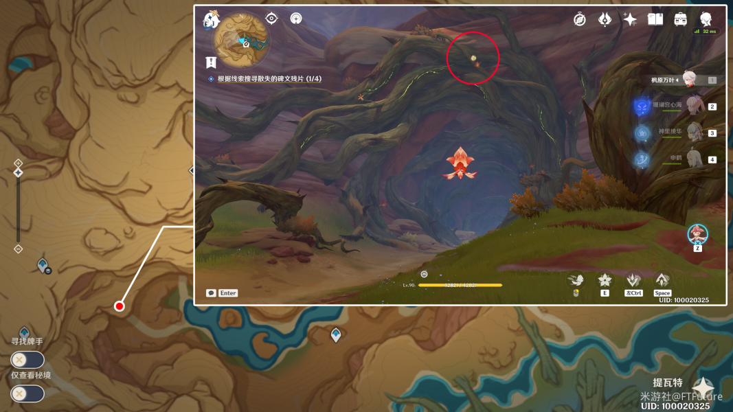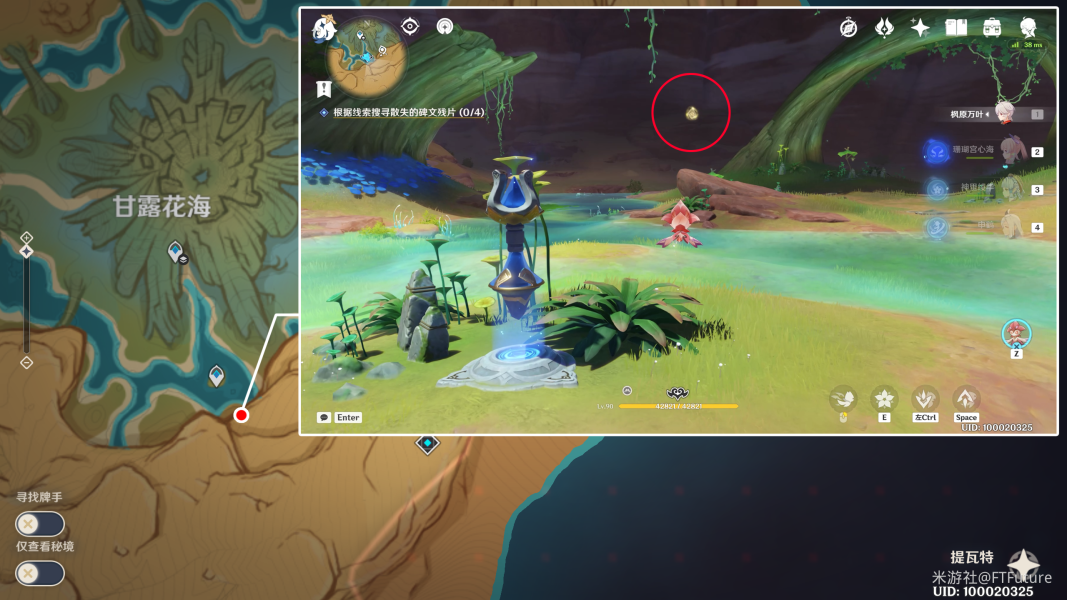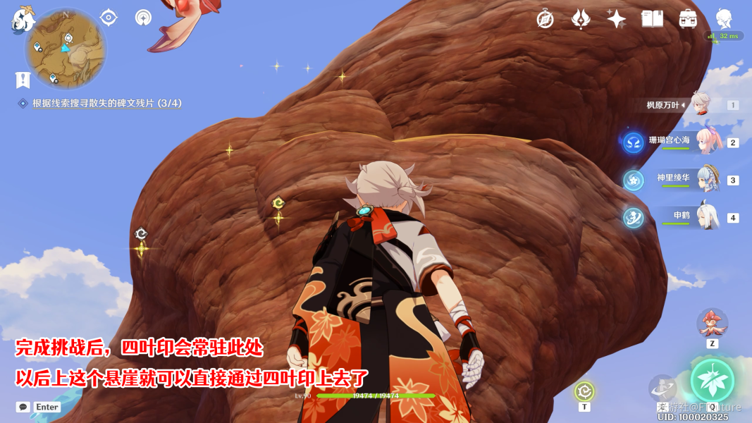 首先从图示位置的传送锚点出发,向南边看,通过四叶印飞到这里的岩石上,上面有一个限时挑战: