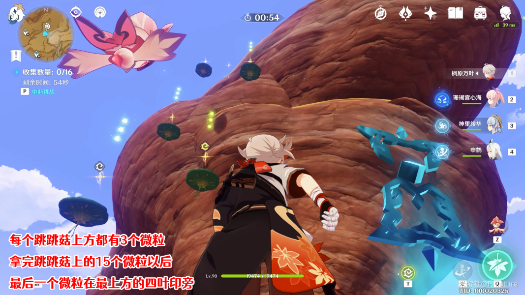 开启这个限时挑战后抬头往东边高处看,这个挑战需要我们在60秒内拾取16个微粒,这里每个跳跳菇上方都有3个微粒,通过四叶印飞过去以后在跳跳菇上跳一下即可拿到,前15个微粒拿完以后,最后1个微粒就在崖顶的四叶印旁边。