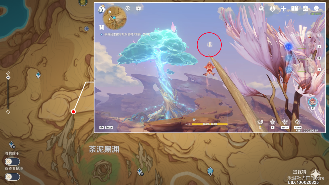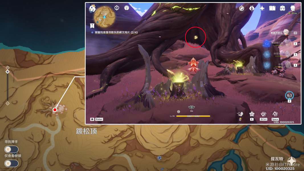关于第4个碑文残片这里额外说一下,因为这颗树非常高,所以如果不先到悬崖,而是直接站在底部操控斯露莎的话,是没法飞到这么高的。所以这里给各位旅行者介绍一下如何快捷登上这里的悬崖。