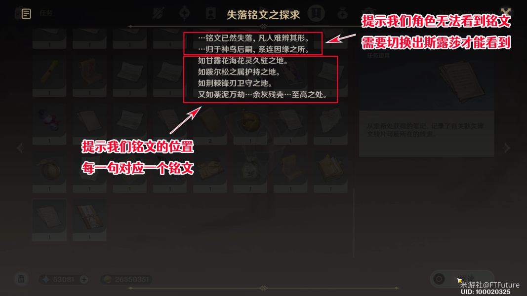 笔记的前两行是在提示我们铭文在操控角色时不可见,需要切换出斯露莎才能看到;后四行则是在暗示碑文残片所在的地点。