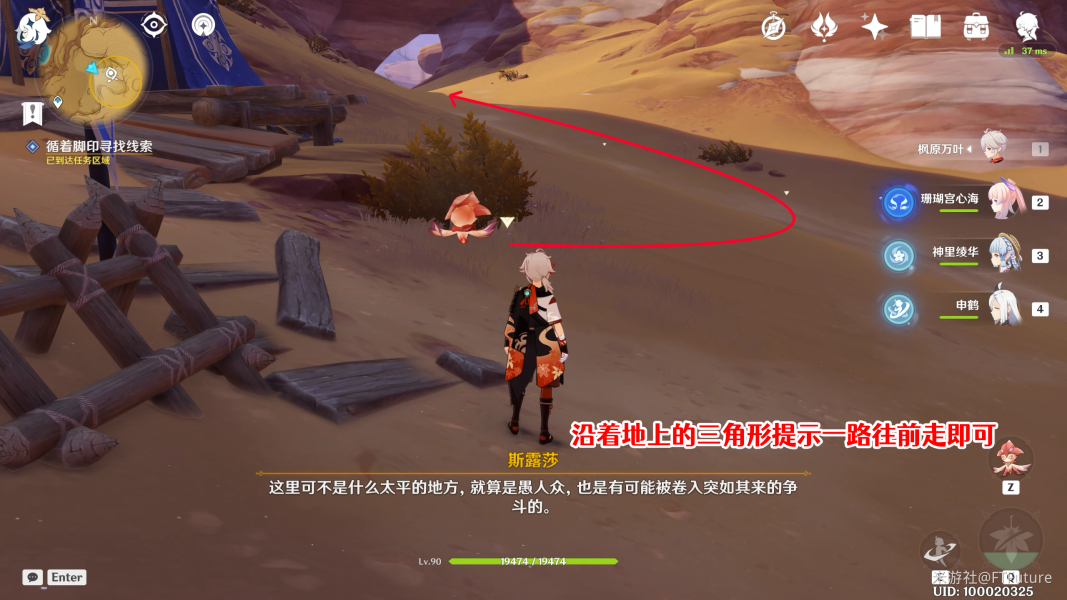 但按着时间过去以后,我们还是没有找到那个愚人众长官,只能顺着脚印寻找线索了。这里我们沿着营地附近的三角形小箭头标记走即可。