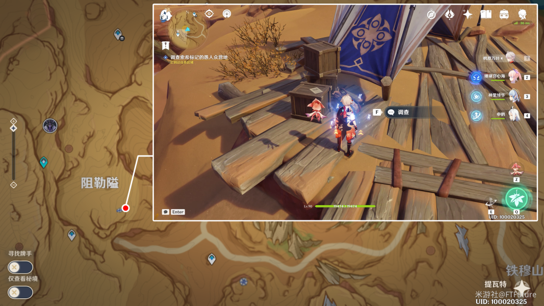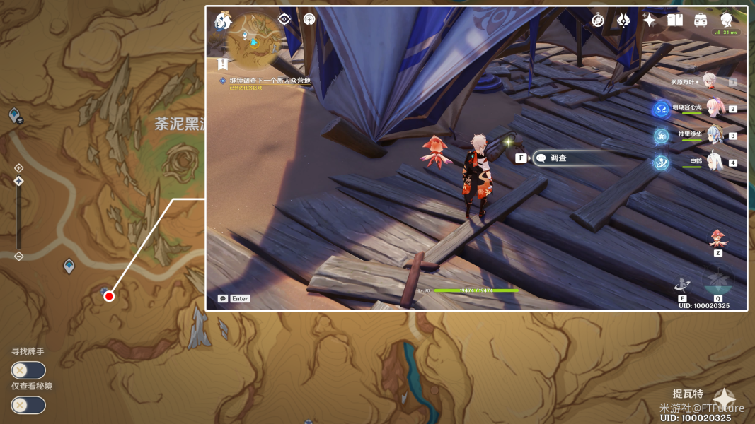 接下来前往荼泥黑渊南边的愚人众营地,同样还是先击败驻扎在这里的愚人众。之后可以看到图示位置的营帐旁有一堆行李,上面有闪光点,我们调查一下这里即可。