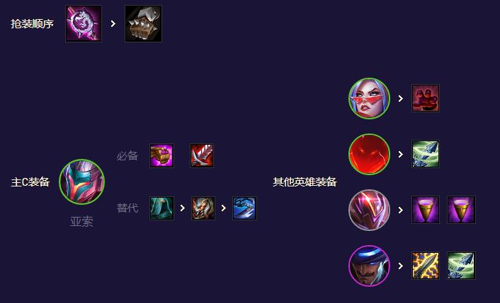 亚索推荐装备:法爆+回复装必备,第三件补水银或泰坦巨杀。水银后期上限更高。眼泪装先给后排做个电刀,电刀的破魔效果比离子更好,更适合亚索。多余眼泪装给亚索做圣杯。腰带魔抗装优先合灵风,先吹亚索面前的人,第二个凌风吹后排主C,落地直接接亚索技能。