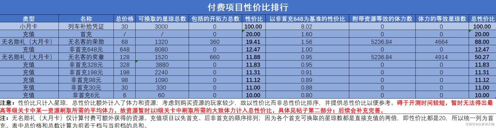 →大月卡(无名客的荣勋、无名客的奖章),括号前是纯抽卡资源性价比,括号内是算上体力价值性价比