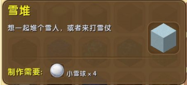 雪方块需要小雪球X4组成,创造模式中可以在背包方块栏中找到,地图上雪地的附近也可以开采到哟~想要去雪地,只有在迷你世界的地图中进行寻找或者使用雪地地图种子,生成雪地。