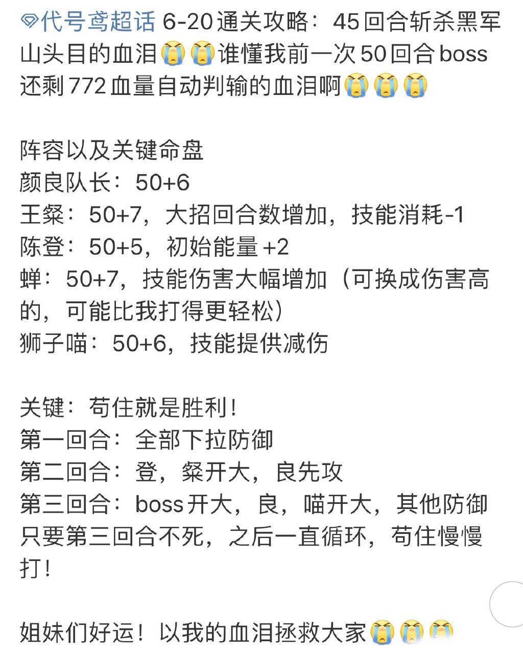第三回合: boss开大,良,喵开大,其他防御