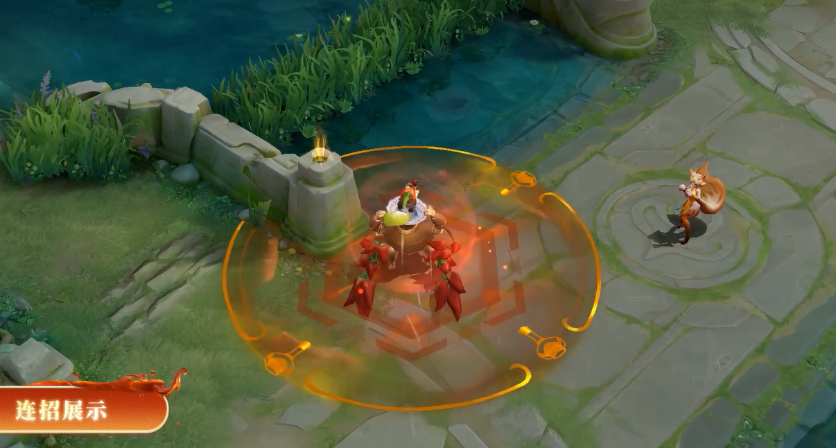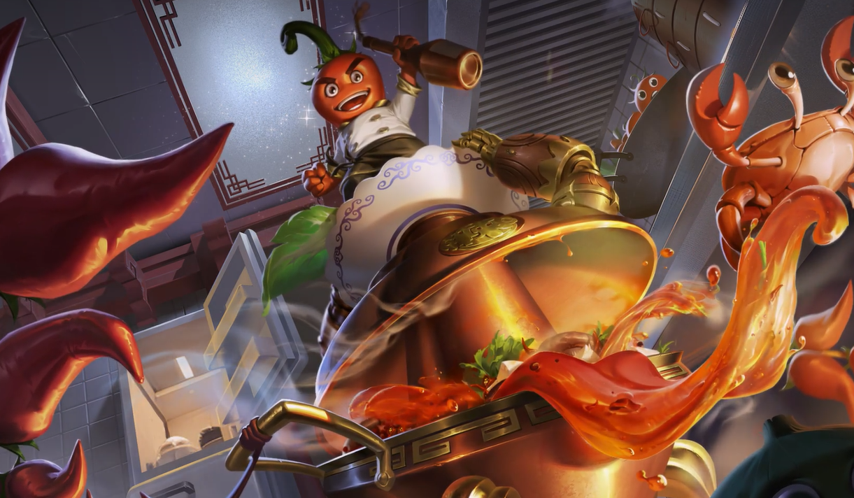 将太乙真人的丹炉以火锅为创意主题进行设计适配。丹炉设计上融入火锅的铜锅元素,丹炉上原本连缀的铁链变为辣椒相连,丹炉的舌头则使用了牛油火锅元素进行视觉传达,让人不由想到吃到辛辣食物时的状态,太乙真人则化身为火爆辣椒,他的药剂瓶则变为止辣醋瓶,整体形象十分生动。