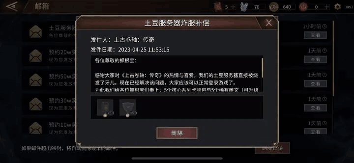 上面全部就是上古卷轴传奇炸服补偿奖励介绍,希望能为各位玩家们带来帮助,想要了解更多游戏攻略及资讯请持续关注多特游戏。以上就是手游巴士为您提供《上古卷轴传奇炸服补偿奖励是什么 上古卷轴传奇炸服补偿奖励介绍》的详细内容,更多精彩内容请继续阅读上一篇《王者荣耀太乙真人火锅皮肤怎么样 王者荣耀太乙真人劲辣红锅皮肤介绍》2023-04-25 王者荣耀太乙真人劲辣红锅怎么样 太乙真人劲辣红锅特效展示