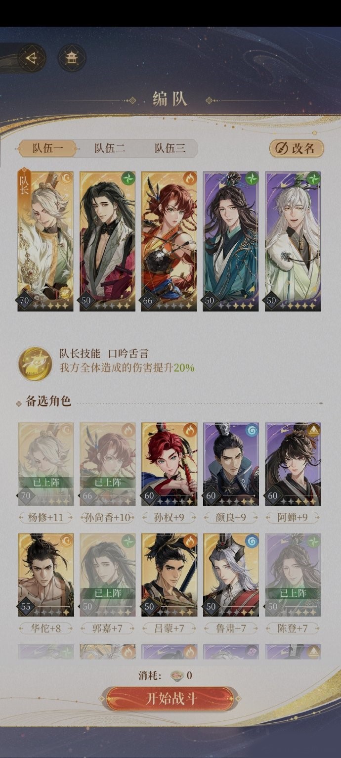 剩下的就是反复凹了,赌杨修扔双数、赌孙尚香暴击。我的杨修3.5星+11,命盘只有2格有效,过的那一次扔了两次双4一次双5,星数低的话可以继续拉修为、赌双6、洗命盘、强星石,都是有机会过的!