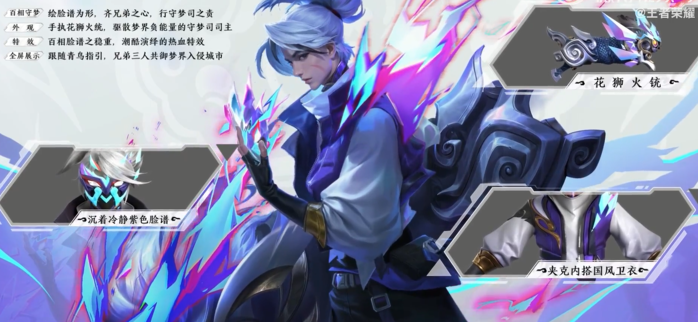 服饰上,设计为短款夹克内搭国风剪裁的高领卫衣,突出人物冷静与干练。武器设定为能驱散梦界负能量的花狮火铳。铳身浮雕以中国传统建筑中的蟠龙形象为基础,龙身形状盘曲环绕。铳口以中国传统的狮头形象为基础,搭配鎏金花纹与蓝紫双色的能量体,兼具古朴的韵味与幻想的奇妙。