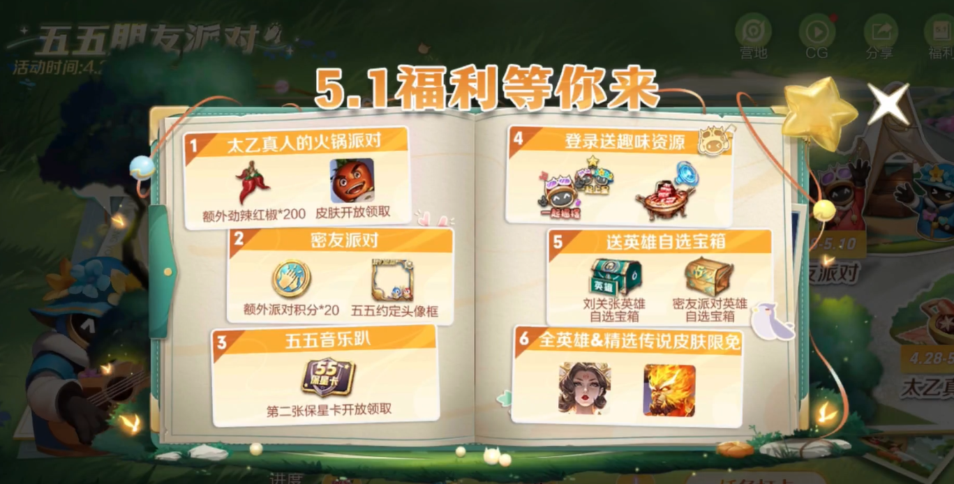 5月1日当天登录就送"上星更上心"限时语音、"大口吃肉"亲密道具等趣味资源;