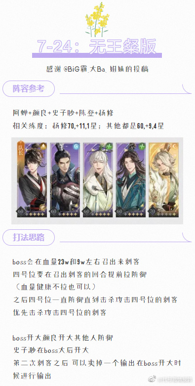 这个阵容的打法:四号位要在召出刺客的回合提前拉防御(血量健康不拉也可以),之后四号位一直防御直到击杀攻击四号位的刺客,优先击杀攻击四号位的刺客。boss开大颜良开大其他人防御,史子渺在boss大后开大,第二次刺客之后 可以卖掉一个输出在boss开大时候进行输出。
