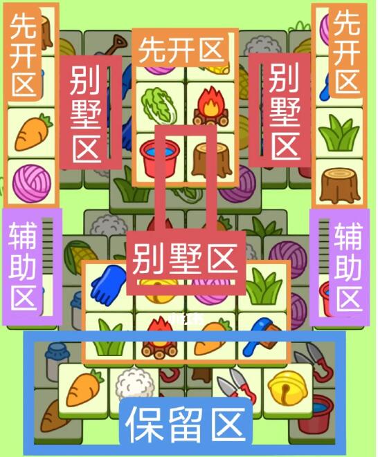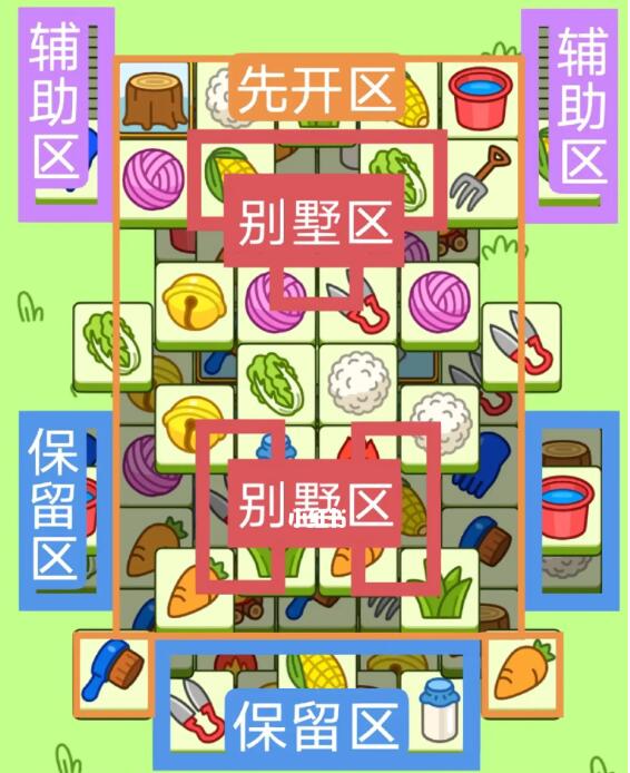 一个倒角形别墅,一个工字型大别墅,开局先消除橙色区。然后按照一层层均匀消除表面牌,哪里压牌比较多就先消除哪里,必要时可以用盲盒区辅助消除表面牌。尽量还是以别墅区内互相消除为主。蓝色区有叠牌,但是不多,全部保留到后期使用。优先使用下面蓝色区。