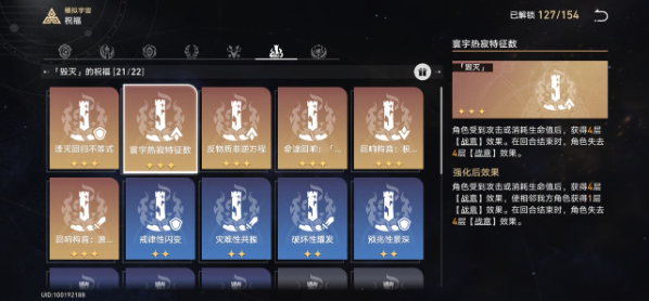 此外,毁灭流派对技能树等级也是有要求的,最起码你也要把技能树点到回响构音Ⅰ,解锁星神的命途回响效果,不然就算你拿到6个毁灭祝福也不会解锁命途回响。