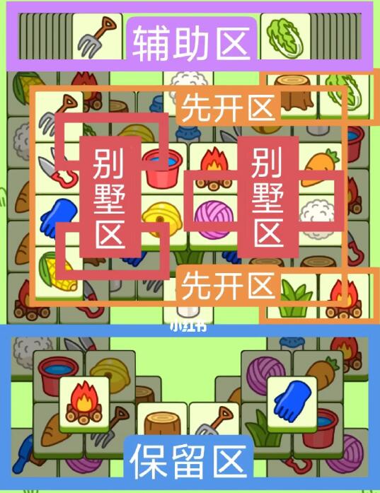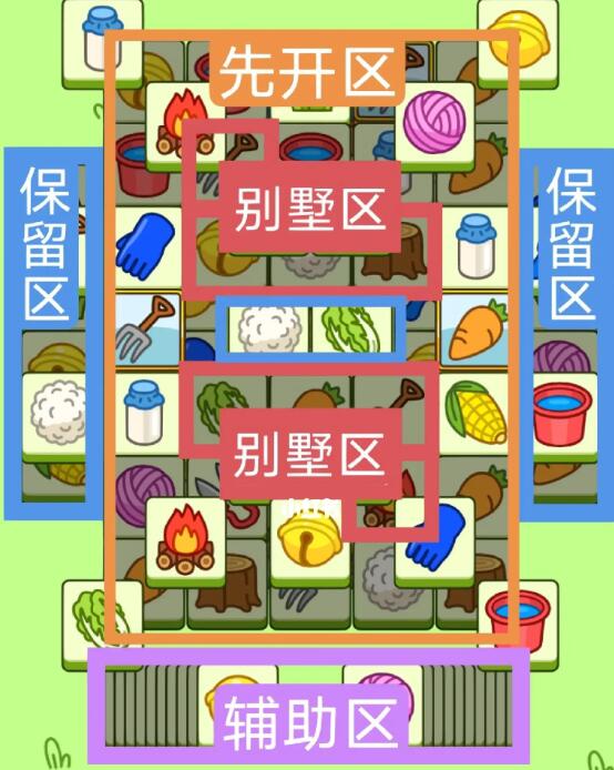 两个L字型大别墅,开局先消除橙色区,然后按照一层层均匀消除表面牌,哪里压牌比较多就先消除哪里,必要时可以用盲盒区辅助消除表面牌。尽量还是以别墅区内互相消除为主。蓝色区有叠牌,但是不多,全部保留到后期使用