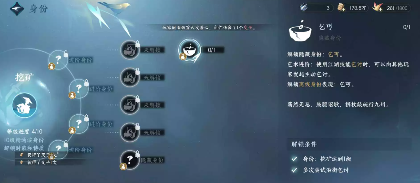 4、乞讨成功一次以后就可以在身份中的挖矿一栏解锁隐藏身份乞丐了。