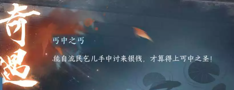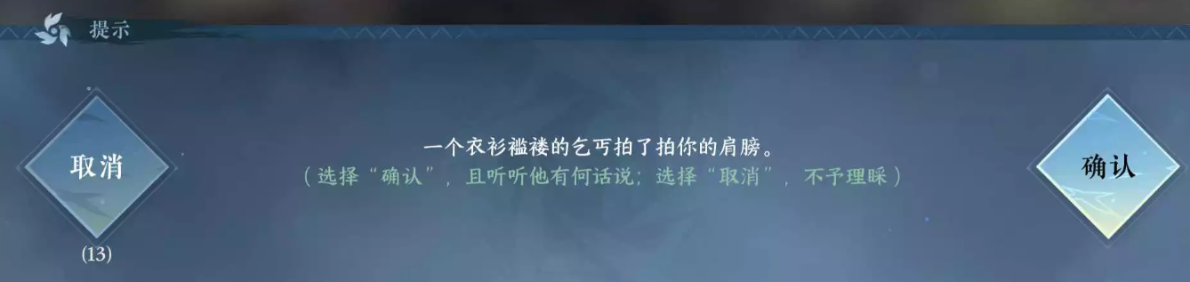 5、这时候会有一个乞丐过来拍你的肩膀(如果没有的话就继续乞讨,运气好乞讨几分钟就来了,运气不好一个多小时都不一定来,记得先看下自己是不是在退出门派的cd中,有时候不会直接触发,会有一个老乞丐出现在你旁边,乞讨看到老乞丐了后起来跟他对话就可)。之后他要啥你就给啥,对话结束后就会触发奇遇任务。